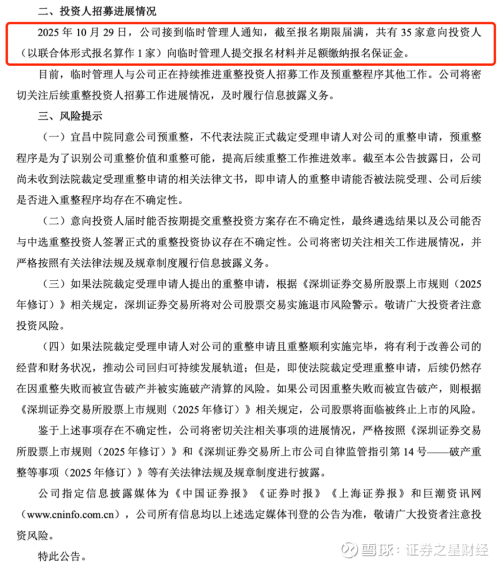 根据公司此前披露,临时管理人曾公开招募重整投资人,一度吸引了35家意向方报名参与。但公司同时坦陈,意向投资人招募结果尚存不确定性,能否与中选方签署正式重整投资协议,仍是悬而未决的变量。更为关键的是,公司在公告中明确提示,宜昌中院同意预重整,并不代表法院已正式裁定受理重整申请;若后续法院裁定受理重整,公司股票交易将被实施退市风险警示。