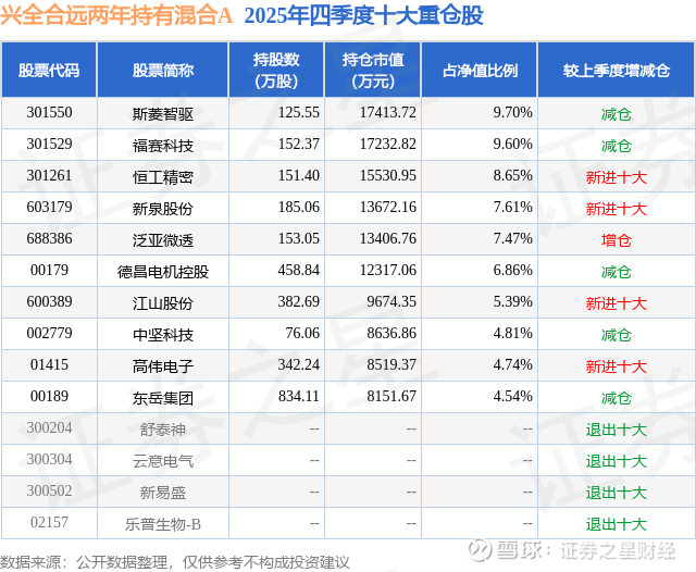 根据2025基金年报公募基金重仓股数据,重仓该股的公募基金共7家,其中持有数量最多的公募基金为兴证全球基金的兴全合远两年持有混合A。兴全合远两年持有混合A目前规模为17.24亿元,最新净值1.0497(4月1日),较上一交易日上涨3.65%,近一年上涨40.96%。该公募基金现任基金经理为吴钊华。
