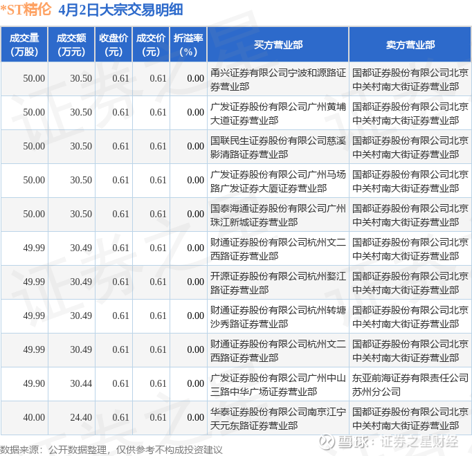 证券之星消息,4月2日*ST精伦发生大宗交易,交易数据如下: