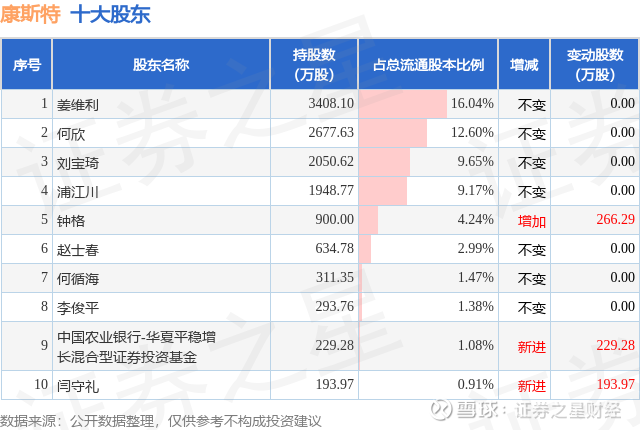 根据康斯特2025年年报公布的十大股东详情如下: