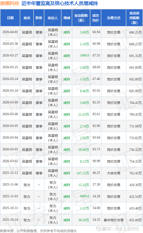 崇德科技近半年内的董监高及核心技术人员增减持详情如下: