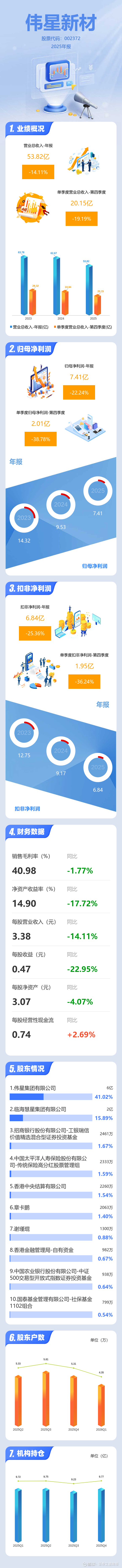 证券之星消息,伟星新材2025年年报显示,当年度公司主营收入53.82亿元,同比下降14.12%;归母净利润7.41亿元,同比下降22.24%;扣非净利润6.84亿元,同比下降25.37%;其中2025年第四季度,公司单季度主营收入20.15亿元,同比下降19.2%;单季度归母净利润2.01亿元,同比下降38.79%;单季度扣非净利润1.95亿元,同比下降36.24%;负债率23.06%,投资收益5969.77万元,财务费用-1005.39万元,毛利率40.98%。