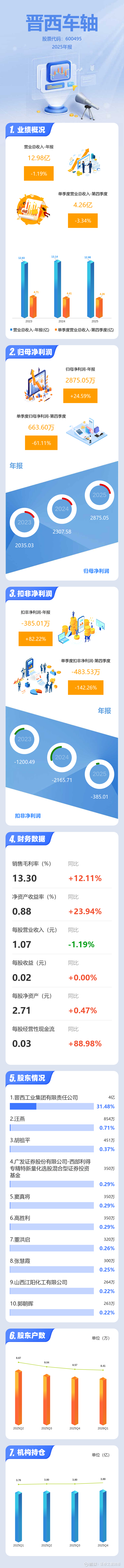 证券之星消息,晋西车轴2025年年报显示,当年度公司主营收入12.98亿元,同比下降1.2%;归母净利润2875.05万元,同比上升24.59%;扣非净利润-385.01万元,同比上升82.22%;其中2025年第四季度,公司单季度主营收入4.26亿元,同比下降3.34%;单季度归母净利润663.6万元,同比下降61.12%;单季度扣非净利润-483.53万元,同比下降142.26%;负债率16.33%,投资收益1924.56万元,财务费用-1183.57万元,毛利率13.3%。