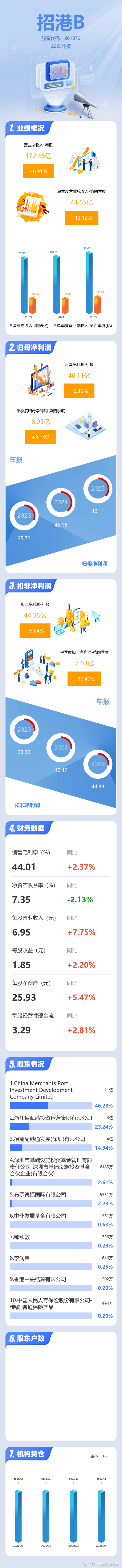 证券之星消息,招港B2025年年报显示,当年度公司主营收入172.46亿元,同比上升6.92%;归母净利润46.11亿元,同比上升2.1%;扣非净利润44.38亿元,同比上升9.65%;其中2025年第四季度,公司单季度主营收入44.85亿元,同比上升13.12%;单季度归母净利润8.05亿元,同比上升3.15%;单季度扣非净利润7.63亿元,同比上升10.41%;负债率35.96%,投资收益64.22亿元,财务费用15.05亿元,毛利率44.01%。