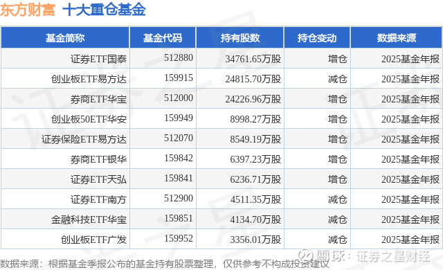 根据2025基金年报公募基金重仓股数据,重仓该股的公募基金共289家,其中持有数量最多的公募基金为国泰基金的证券ETF国泰。证券ETF国泰目前规模为570.29亿元,最新净值1.0258(4月2日),较上一交易日下跌1.74%,近一年下跌5.82%。该公募基金现任基金经理为艾小军。艾小军在任的基金产品包括:国泰金融ETF联接A,管理时间为2014年1月13日至今,期间收益率为156.14%;金融ETF国泰,管理时间为2014年1月13日至今,期间收益率为174.58%;黄金ETF国泰,管理时间为2014年1月13日至今,期间收益率为308.98%;国泰中证计算机主题ETF联接A,管理时间为2015年3月26日至今,期间收益率为-3.61%。
