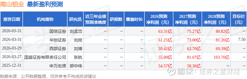 南山铝业(600219) l投资要点 事件:公司发布2025年年报,报告期内公司实现营业收入346.20亿元,同比增长3.41%;实现归母净利润/扣非归母净利润47.36/46.10亿元,同比下滑1.96%/6.08%。Q4公司实现营收/归母净利润82.95/9.63亿元,同比下滑10.34%/28.12%,实现扣非归母净利润8.59亿元,同比下滑42.70%。 氧化铝价格下跌影响公司业绩。公司业绩下滑主要由于氧化铝价格下跌,2025年氧化铝价格下跌21.49%,产量增长10.27%,整体氧化铝业务毛利率下滑7.95pct,毛利同比减少4.83亿元,下滑12.32%。 高端产品占比提升。铝加工产品方面,公司合金锭/铝型材/热轧卷/板/冷轧卷/板/铝箔产量同比-5.81%/-16.93%/-3.67%/-4.99%/-17.56%,汽车板、航空板等高附加值产品销量占铝产品比例提升2pct至16%,毛利约占铝产品的26%,较2024年提升3pct,未来随着高端产品产能释放,将进一步强化公司业绩稳健性与持续成长性。 公司面向十五五积极布局,电解铝/氧化铝产量持续增长。 (1)提升高端产品产能,建设高端轻量化铝板带项目,实现产能扩张,提高市场占有率。 (2)通过全资子公司出资建设印尼宾坦工业园年产25万吨电解铝、26万吨炭素项目,项目建设进行中。 (3)通过子公司PT.Bintan Alumina Indonesia于印尼工业园内分两期扩建年产200万吨氧化铝及其他配套公辅设施。项目目前已全部投产,2026年预计产量增长。 (4)公司拟通过在印尼合资成立公司PT Bintan Fine ChemIndonesia投资建设年产20万吨烧碱及年产16.5万吨环氧氯丙烷项目,目前正在积极推进基础设施建设。 高频次、高比例分红,积极回馈股东。公司2025年先后在半年度及特别分红派送现金红利4.62/29.72亿元(含税),年度计划分红15.62亿元(含税),全年累计分红比例为105.49%。根据公司承诺,公司计划2024-2026年度每年以现金方式分配的利润不少于当年实现的可分配利润的40%,且每年以不低于3亿元人民币自有资金回购股份并注销,2026年初至今累计使用资金0.65亿元回购。 投资建议:考虑到公司氧化铝产能陆续放量,印尼电解铝项目顺利推进,公司未来产量持续增长,预计公司2026/2027/2028年实现营业收入361.80/376.08/394.46亿元,分别同比变化4.51%/3.95%/4.89%;归母净利润分别为50.00/55.80/60.84亿元,分别同比增长5.59%/11.59%/9.04%,对应EPS分别为0.44/0.49/0.53元。 以2026年3月27日收盘价为基准,2026-2028年对应PE分别为13.55/12.14/11.14倍。维持公司“买入”评级。 l风险提示: 价格波动风险;项目进度不及预期风险;下游需求不及预期风险;模型假设与实际不符;政策超预期风险等。