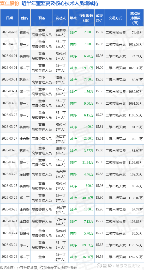 富佳股份近半年内的董监高及核心技术人员增减持详情如下: