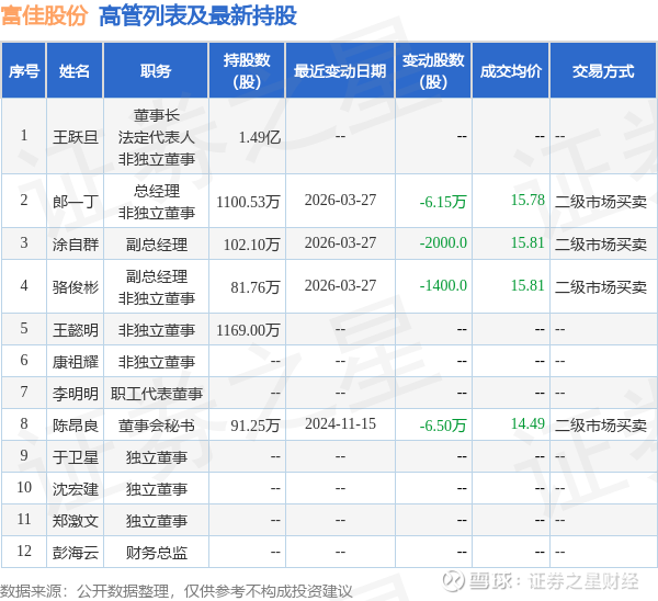 富佳股份的高管列表及最新持股情况如下:
