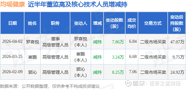 均瑶健康近半年内的董监高及核心技术人员增减持详情如下:
