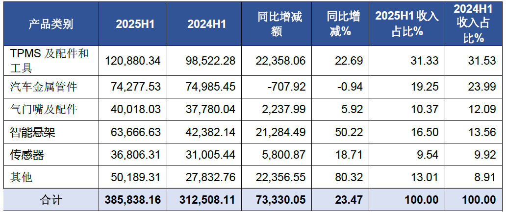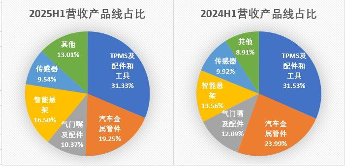 营收突破 38 亿,增速 24%:2025 年 1-6 月,公司实现营业收入 39.50 亿元,同比增长 24.06%,远超全球车市 2.13% 的销量增速(据 Marklines 数据)。这一增长主要来自智能悬架、TPMS(轮胎压力监测系统)、传感器等核心产品线的发力,尤其是智能悬架业务同比激增 50.22%,成为最强增长引擎。