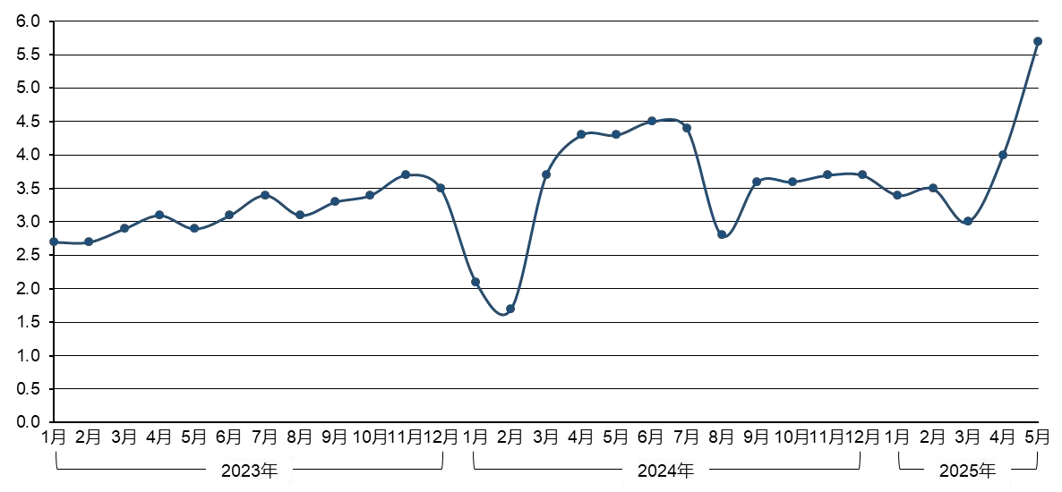 2023-2025 年中国乘用车空气悬架月度渗透率