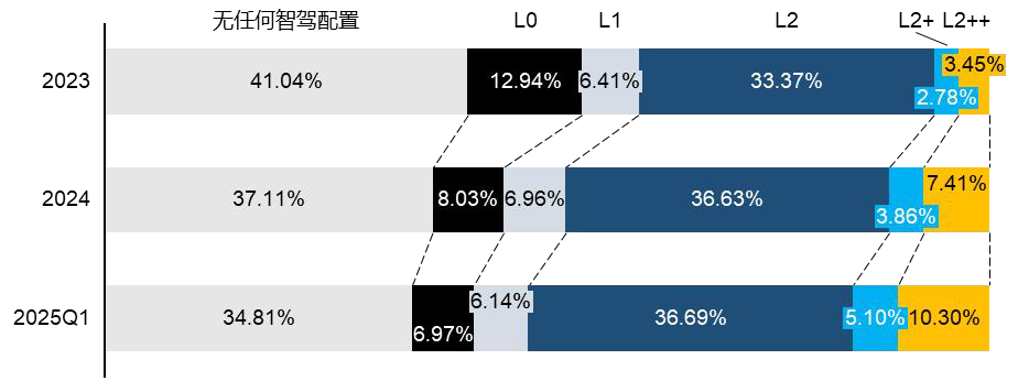 2023-2025 年中国乘用车不同智驾等级的渗透率