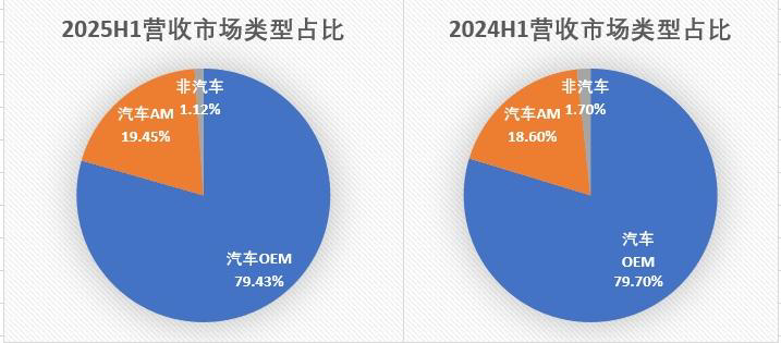 OEM 与 AM 市场双增长:OEM 市场(整车配套)实现收入 30.65 亿元,同比增长 23.05%,占总营收 79.43%,仍是核心收入来源;AM 市场(售后维修)实现收入 7.50 亿元,同比增长 29.11%,增速高于 OEM,体现售后市场的高弹性。