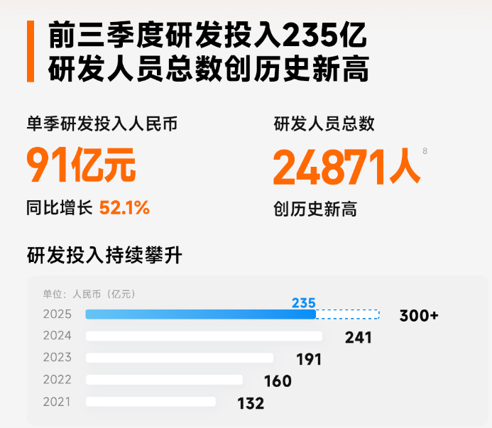 从2021年以来的五年,小米的研发费用分别为132亿、160亿、191亿、241亿、320亿(预计)。2025年看到的成果,是两年前2023年191亿投入的产出,就这种投入水平,小米已经取得了纽北总榜第三、量产电车第一、比肩高通和苹果性能的3nm芯片这些无比硬核的成就。那么241亿、320亿的投入,又会在明年、后年给我们带来多少核心科技上的突破?我非常期待。