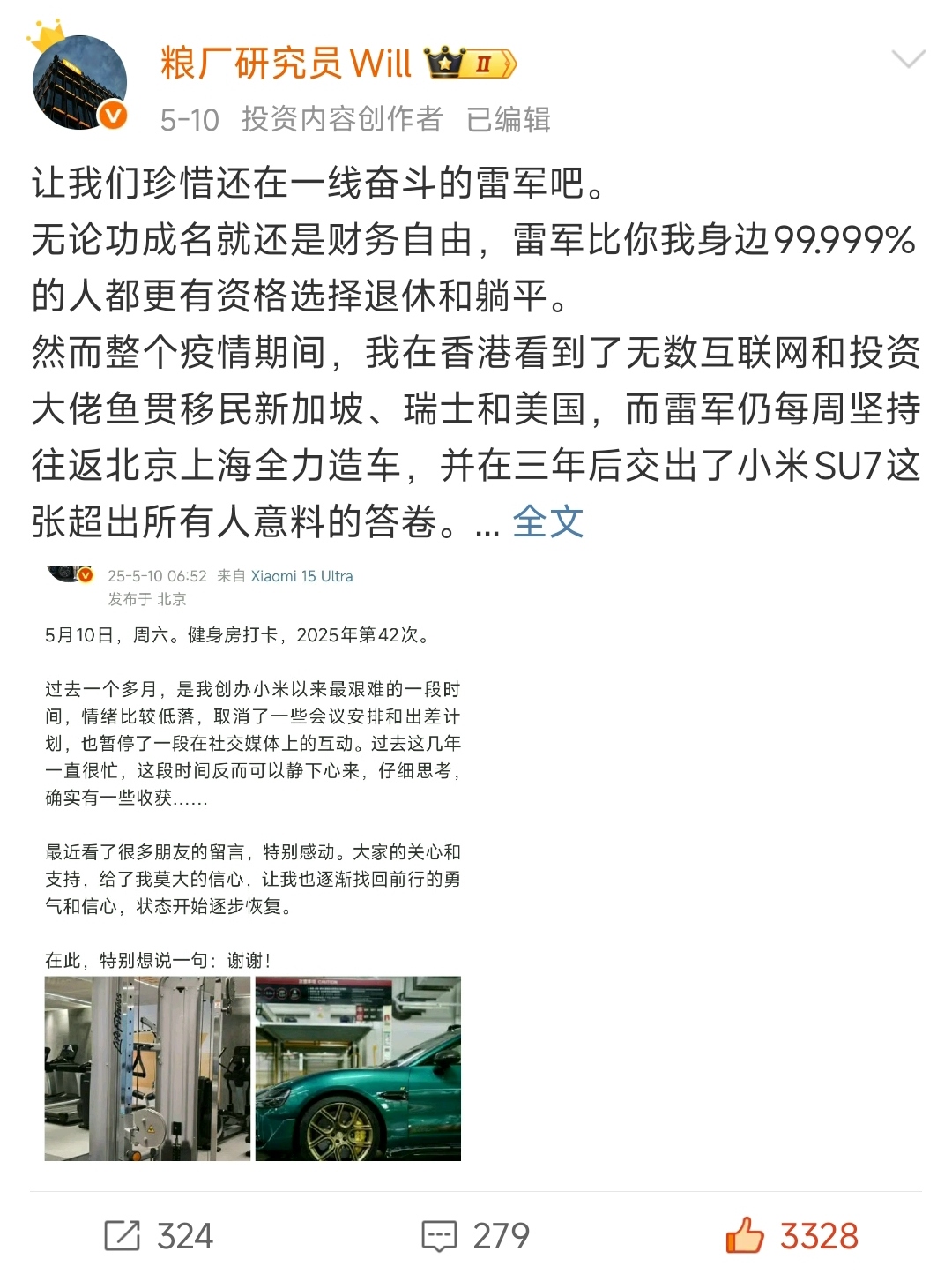 我的好友Will@粮厂研究员Will 常说的一句话是“让我们珍惜还在一线奋斗的雷军吧”,这句话,我无比赞同,对每一位小米投资者也至关重要。