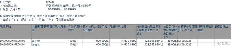 $呷哺呷哺(00520)$老大增持了,强烈看涨!根据联交所最新权益披露资料显示,2025年9月12日,呷哺呷哺(00520.HK)获执行董事兼主席贺光启在场内以每股均价0.839港元增持100万股,涉资约83.9万港元。增持后,贺光启最新持股数目为423,655,860股,持股比例由38.91%上升至39.00%。