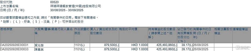 $呷哺呷哺(00520)$老大再次增持了,强烈看涨!根据联交所最新权益披露资料显示,2025年9月26日,呷哺呷哺(00520.HK)获执行董事兼主席贺光启在场内以每股均价1.00港元增持87.95万股,涉资约87.95万港元。增持后,贺光启最新持股数目为425,493,860股,持股比例由39.09%上升至39.17%。