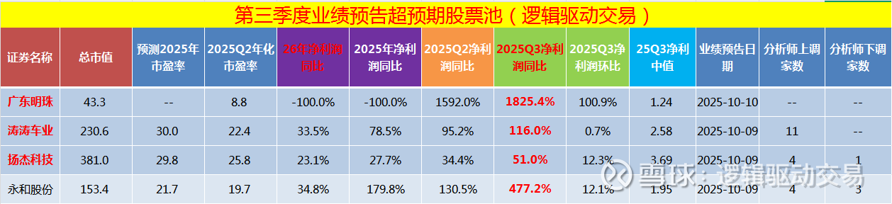 一、第三季度业绩预告超预期个股汇总:本表格一共有4只个股。分别是广东明珠、涛涛车业、 扬杰科技、永和股份。