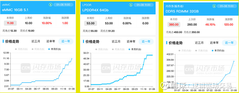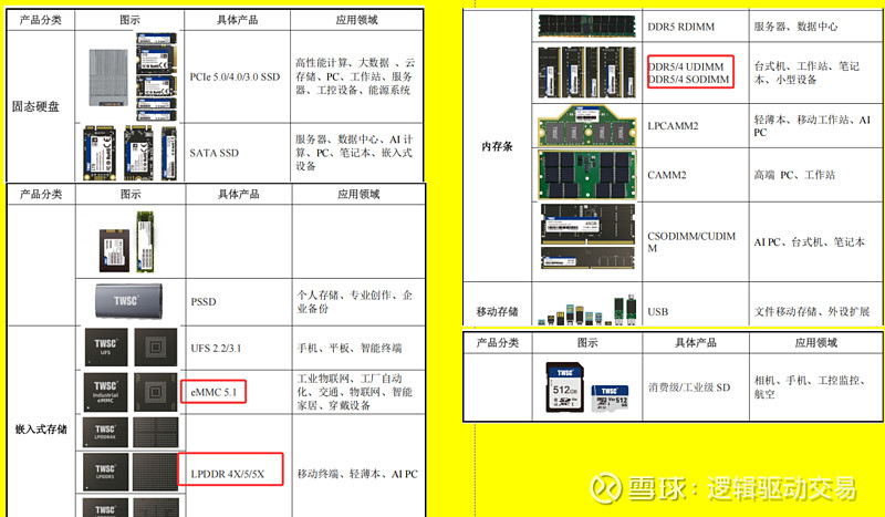 产品:下图标红的产品,属于目前涨价比较猛的,比如嵌入式存储的EMMC、UFS、LPDDR 4X、5X。服务器所用的DDR4、5内存条。