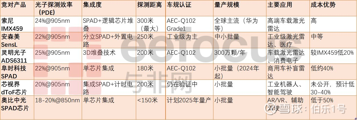 索尼IMX459是全球首款车规级堆叠式SPAD(单光子雪崩二极管)SoC芯片,专为车载激光雷达(LiDAR)系统设计,从技术来看,索尼IMX459凭借其24%@905nm的光子探测效率、6ns的响应速度以及高度集成的SoC设计,在车载激光雷达市场中占据技术领先地位,难以被竞争对手短期内超越。索尼IMX459在全球范围内的车载激光雷达市场占有率较高,安森美、滨松等公司虽然在某些技术领域有所优势,但在集成度、车规认证和量产能力方面不如IMX459。