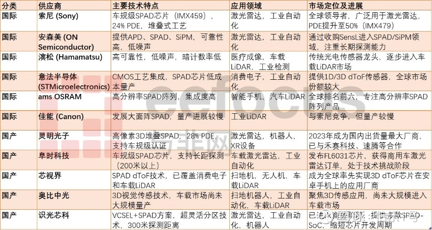 目前,全球SPAD芯片市场主要由安森美、滨松和索尼等海外巨头主导。尤其在车规级大面阵SPAD芯片领域,这些厂商占据了全球市场的90%以上份额。然而,国内厂商通过技术突破、车规认证等手段,正在逐步进入SPAD芯片的供应链。