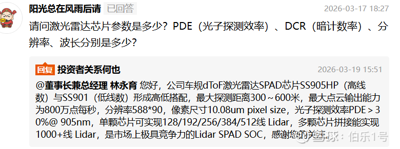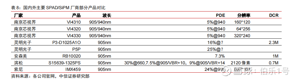 问了好久的问题,今天终于在业绩交流会上解答了:公司车规dToF激光雷达SPAD芯片SS905HP(高线数)与SS901(低线数)形成高低搭配,最大探测距离300~600米,最大点云输出能力为800万点每秒,分辨率588*90,像素尺寸10.08um pixel size,光子探测效率PDE>30%@ 905nm,单颗芯片可实现128/192/256/384/512线 Lidar,多颗芯片拼接能实现1000+线 Lidar,是市场上极具竞争力的Lidar SPAD SOC。很多人可能不知道这意味着什么?但是我完全可以负责任告诉你,碾压市面上所有SPAD芯片,包括索尼IMX459(供货华为)和滨松(供货速腾)。
