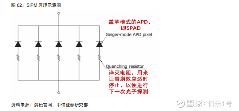 而SiPM(Silicon Photo-Multiplier,硅光电倍增管,滨松也称为MPPC,多像素光子计数器)就是一组并联的SPAD,用于弥补SPAD对光强感知能力不足的问题。由于SPAD只需1个光子就会发生雪崩,同时有100个光子入射和1个光子入射并不会带来什么区别。为了解决这一问题,直接将大量SPAD并联,通过发生雪崩的SPAD数量即可判断光强。如今使用SPAD探测器的激光雷达通常都会直接使用SiPM,而不是单个的SPAD。