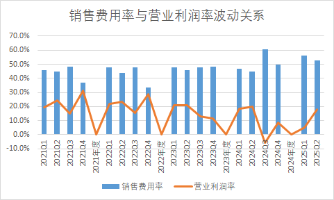 2、 从2021年到2024年上半年销售费用率都没有突破50%,但是平均也在40%以上;但是24年三季度失控高到60%,25年一季度回落到56.1%,二季度52.9%,从图中看出销售费用率一、三季度高,二、四季度回落,所以目前无法判断究竟是公司削减品规导致销售费用率逐季度缓慢回落,还是新一轮高增长(费用率)的开始,要看三季度报告才能有结论。