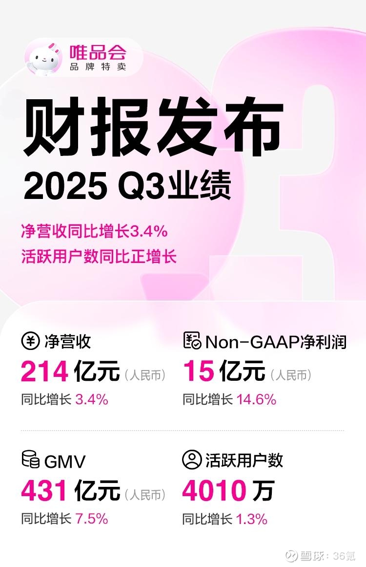 11月20日美股盘前,唯品会发布2025年第三季度财报。三季度,唯品会实现净营收214亿元(人民币,下同),同比增长3.4%;Non-GAAP净利润15亿元,同比增长14.6%。