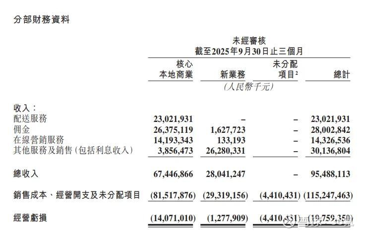 回到美团自身,公司三季度实现营收955亿元,同比增长2%;经调整净亏损160亿元,主要源自核心本地商业经营亏损141亿元。