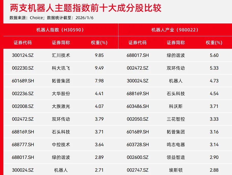 从前十名成分股来看,两支指数重合度并不高。机器人(H30590)包含了科大讯飞和大华股份等AI语音和机器视觉领域的股票,与人工智能科技领域联系更紧密。机器人产业(980022)更关注细分领域,从事精密减速器的绿的谐波、家电制造的科沃斯等个股都被赋予较高权重。