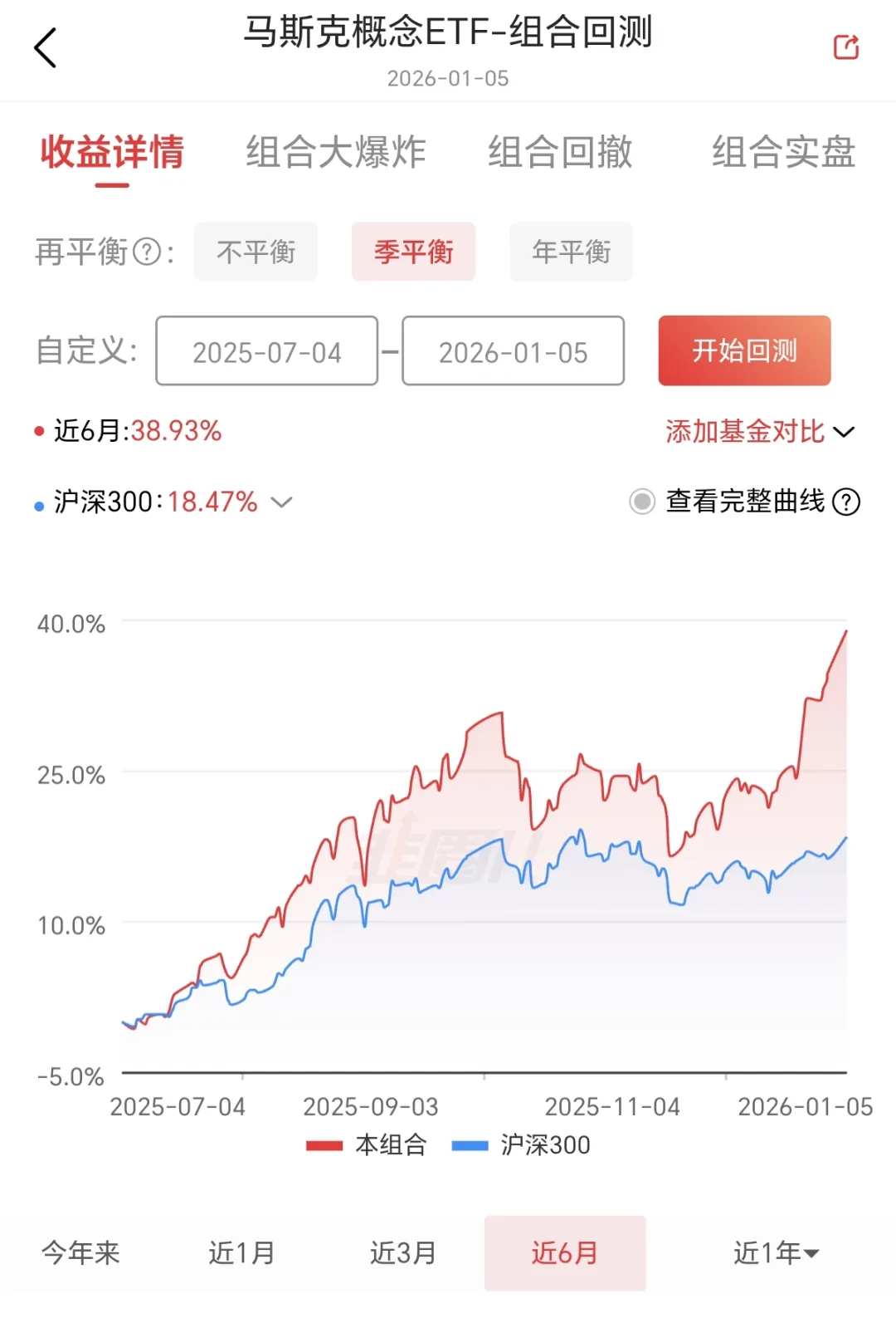 我选取了马斯克科技商业帝国中其他四个重点板块中规模最大的ETF:新能源车ETF(515030)、机器人ETF(562500)、卫星ETF(159206)和医疗器械ETF(159883),用韭圈儿APP以等权重方式构建了一个组合,回测数据表现很不错,过去半年涨了38.93%。