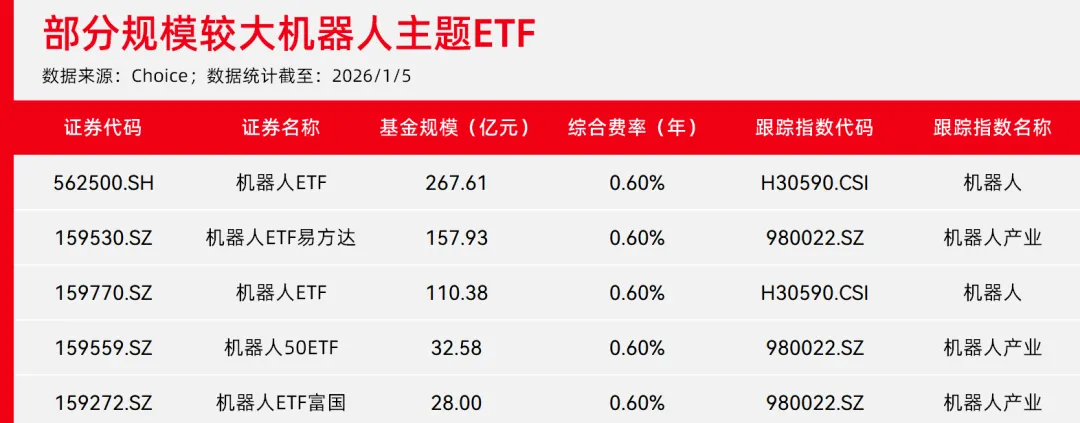 具体到ETF产品端,机器人ETF(562500)是目前市场上规模最大的机器人主题ETF。这支ETF规模已经超过200亿元,在国内市场高居规模榜前50名。去年,这支产品规模从年初的41.53亿元暴涨至267.61亿元,涨幅高达5.4倍,是机器人领域当之无愧的规模巨无霸。