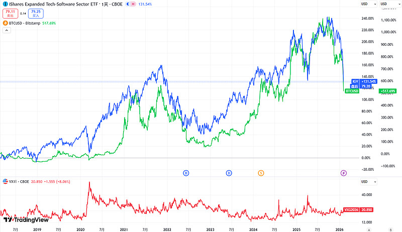 上图蓝线是$北美科技软件股指数ETF-iShares(IGV)$ ,绿线是大饼。二者相关性较高,去年11月之后同步开始大幅下跌。