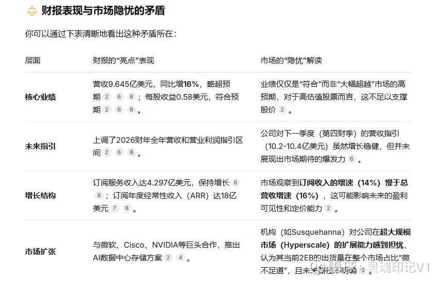 总而言之,Pure Storage的暴跌是一场典型的 “高预期下的预期修正” 。财报本身不错,但市场此前基于AI叙事给予了过高的期望和估值。当现实(稳健增长)无法匹配这种“梦幻”预期时,就引发了剧烈的估值调整。