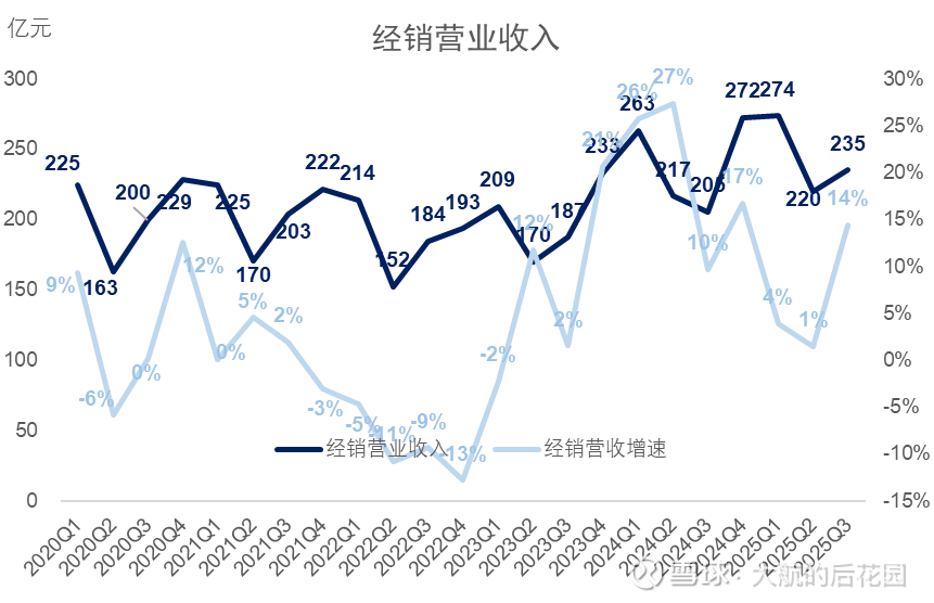 经销收入方面,今年第三季度的经销收入235亿元,同比增长14%,这个增速明显快于今年的前两个季度。换句话说,在今年极其严峻的市场形势下,茅台的经销商反而拿了更多货。
