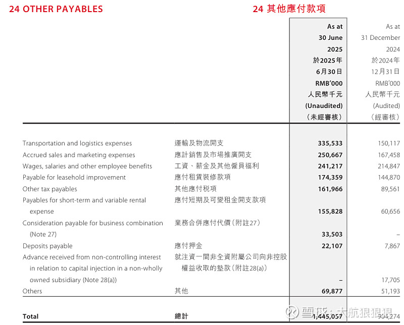 其他应付款项主要包括物流运输、营销开支、人员工资、装修开支、应付税款等杂七杂八的开支,关注意义不大。