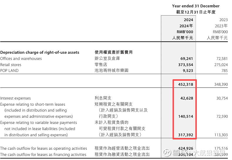 2024年财报显示,泡泡玛特使用权资产当年产生的折旧为4.52亿元。这部分折旧是固定租金产生的折旧,在此基础上还要加上短期租赁开支和可变租赁开支,另外还有少量的“利息开支”。综合算下来,影响利润表的总金额在9.5亿元人民币左右。这些金额中的大部分应该都计入了经销及销售开支,毛估估大概有8亿左右。