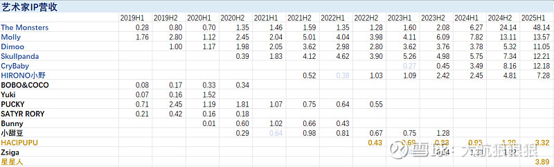 (3)IP的增速有快有慢,这几年成长起来的IP既有厚积薄发的IP,也有迅速爆发的IP,前者的代表是Skullpanda、HIRONO小野,后者的代表是Crybaby和星星人。