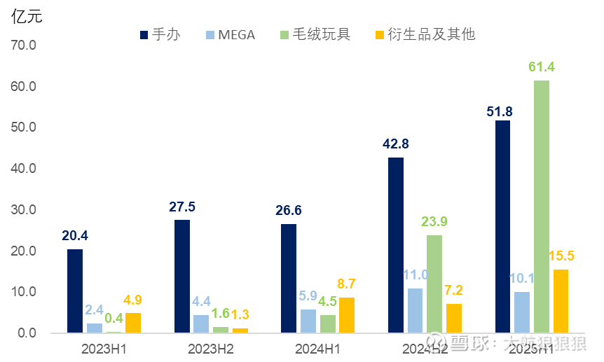 (2)2025年上半年环比2024年下半年,泡泡玛特的收入增长几乎全部由毛绒品类贡献。此时,泡泡玛特管理层已经意识到了毛绒品类的潜力,其展示型、社交传播性以及触觉体验带来的情绪价值比传统手办强很多。因此,随着毛绒产能的提升,毛绒品类也被平移到其他IP上。现在打开泡泡玛特的小程序翻阅,星星人、Crybaby、小野、Dimoo都有了毛绒……