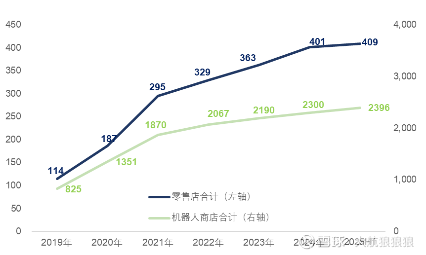 先来看国内市场的表现,从零售店的数量来看,2022年以后,中国内地市场的开店速度就明显放缓。2021年底至2024年底,零售店和机器人商店数量三年间的年复合增长率分别为10.8%、7.1%。