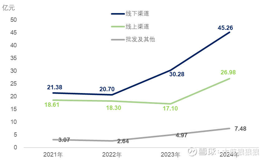 如果再往下深扒一层,2024年的爆发,主要集中在下半年。2024年上半年,批发渠道收入仅为1.58亿,同比增长幅度为20%出头。线上渠道虽然在上半年已经实现高速增长,但收入规模只有2.47亿元,不到下半年线上收入的四分之一。