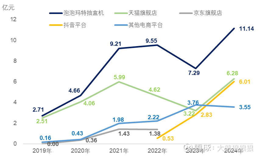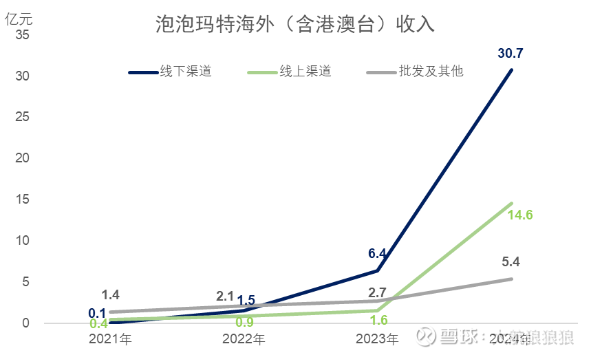 (2)2024年,泡泡玛特海外收入出现全渠道的爆发式增长,在海外零售店总数增长62.5%的基础上,海外线下渠道收入增长了380%。与此同时,海外批发渠道也出现了翻倍增长的势头;而线上渠道的增速最快,2024年的海外线上收入规模是2023年的9倍多。