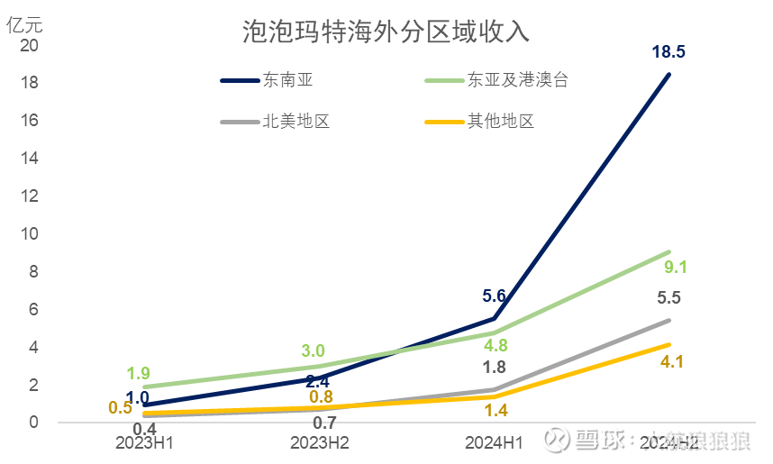 接下来,我们把视角聚焦到2023年和2024年这两年间各个海外市场的表现。在这两年的财报中,泡泡玛特财报中对海外市场分区的口径是:东南亚、东亚及港澳台、北美地区、其他地区。