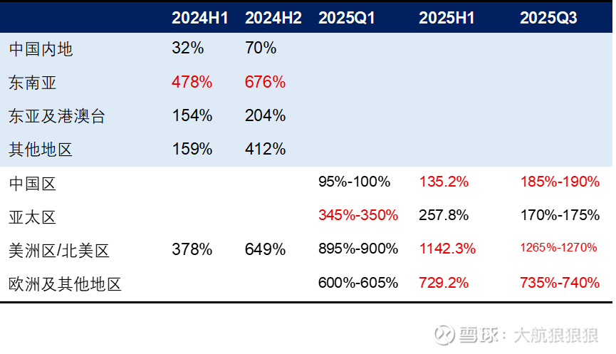 梳理完以上的过程, 2024年至2025年各时段各区域的同比增速如下。表格中,红色的数字代表受到Labubu热潮明显带动的增速;与之相反,黑色数字代表Labubu热潮影响有限的营收增速。