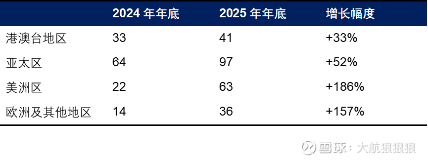 进行业绩预测前,先看一下泡泡玛特2025年海外各区域的开店进度。由于公司官方披露的财报并没有年初和年末的店铺数量,大航在这里采用的是第三方机构调研数据,与前文引用自官方财报的半年度数据肯定存在出入,无需过度纠结,这部分等2025年年报正式公布后会根据公司财报进行修正: