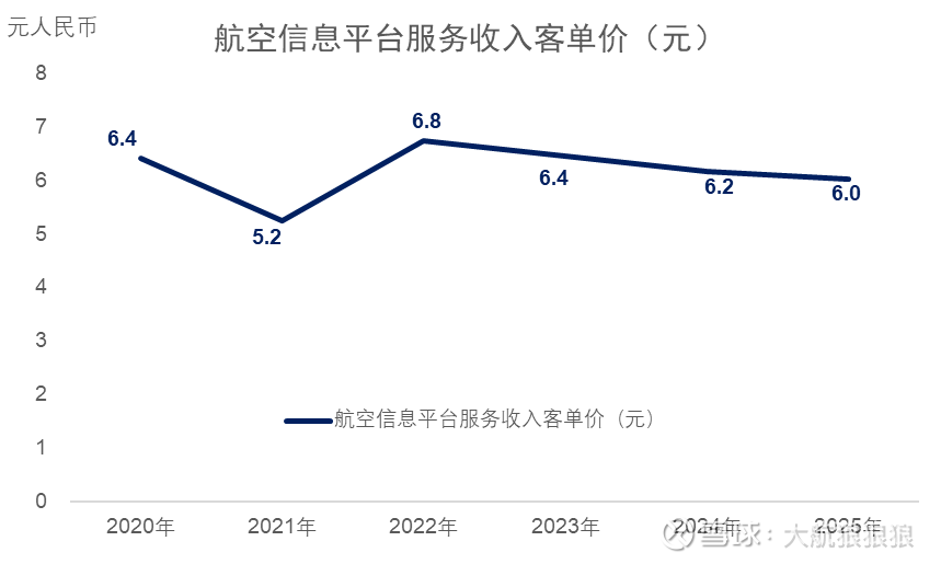 面向航司的“航空信息平台服务收入”依然是中航信的业绩支柱,其他板块的影响均不大。从常规思路出发,这块收入可以拆分为量和价两方面。从量来看,2025年中航信电子分销系统的业务量为7.67亿人次,同比增长4.7%。单价上依然在下降,2025年“客单价”为6.02元,相较于2024年的6.18元下降了大约2.6%。