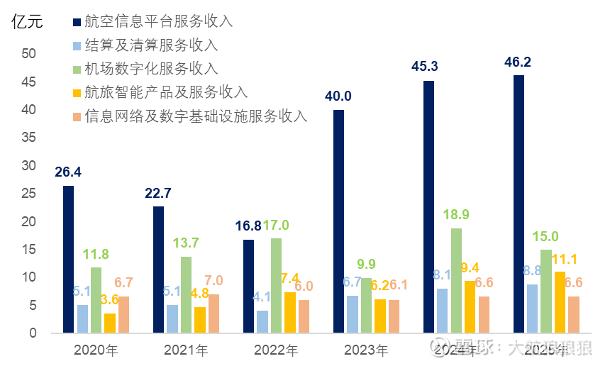 而“机场数字化服务”从历史上来看就有很强的周期性,2025年下滑的直接原因是2024年基数高。目前,我国机场建设总投资增速在放慢,中航信承接的项目估计也会越来越零散,越来越趋向于已有设施的升级,我想这也是这个板块改名的一个考虑——从信息化系统的搭建转为数字化转型升级。中长期来看,这块业务的收入暂时看不到太大的增长空间。