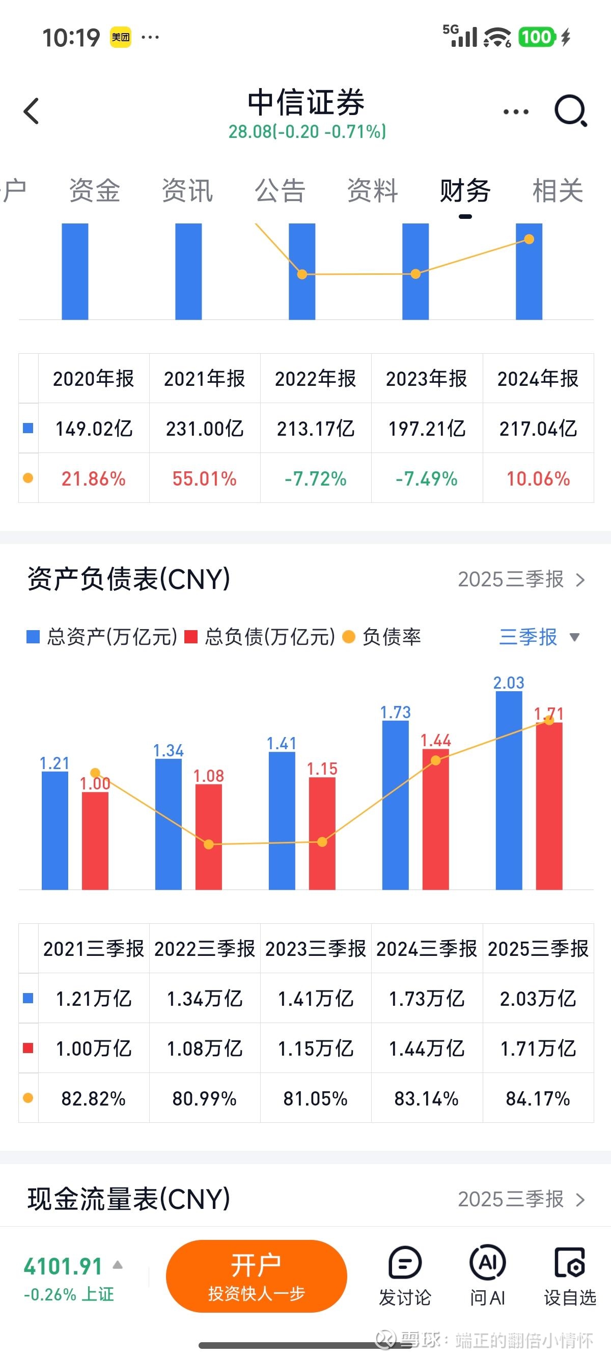 现在看中信证券的资产负债表roe虽然不高但是在熊市也能维持在8%左右,具体原因就是国内资本市场蓬勃发展,融资额度屡创新高现在具体应该是有2.6万亿左右了,公募基金业务规模也是越来越大,市场成交量都是2万亿以上了,科创跟投也是如火如荼啊。总资产从21年的1万亿左右到25年的2万亿,资产量是翻倍的而且主要是靠内生性的增长。未来个人判断资产量到4万亿是正常水平吧,村里不是说打造航母吗,持续扩表利润也会持续增加的。