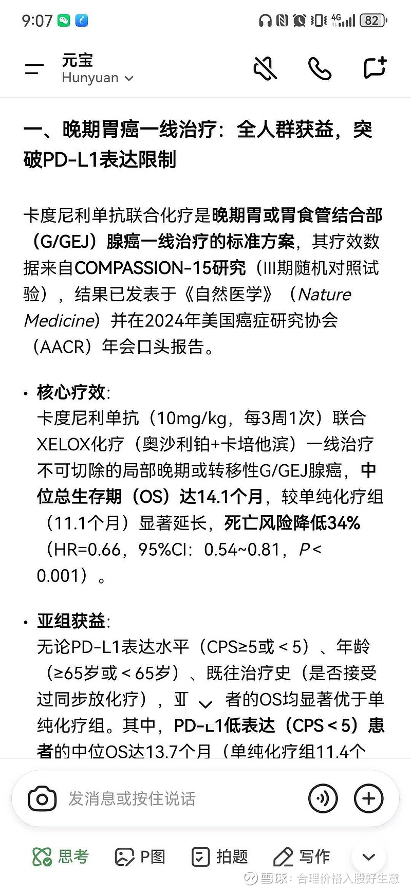 $创胜集团-B(06628)$12号,小芳的卡度尼利PD-1和CTLA-4 双抗(AK104)获批全球三期,要与BMS的纳武利尤单抗在胃癌上做头对头。卡度尼利的优势是PD-1低表达也有效。卡度尼利的mOS为17.48个月,比比创胜001的20.4个月差,FPS差查到的数据8.18个月,也比001的16.6个月低。(19号更新)面对卡度尼利的竞争,BMS更有动力买001,买了001,就比卡度尼利更优,否则就会被抢市场份额。